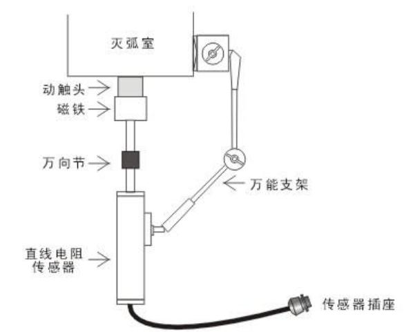 200mm、300mm用于SF6開關(guān)行程,速度的測量,此兩種傳感器為非標(biāo)準(zhǔn)配置。以某型號真空開關(guān)為例,如下圖。直線電阻傳感器在安裝時(shí),要保證傳感器運(yùn)動(dòng)軸能夠直線運(yùn)動(dòng),用磁性萬能支架固定好傳感器。對于SF6開關(guān)、油開關(guān),方法類似。